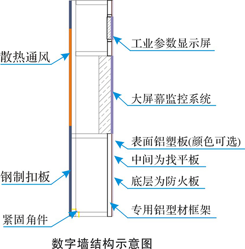 墻體的正表面可選用鋁塑板、鋁板、鋼板或石材等材料拼接而成。墻體背面為鋼制扣板結(jié)構(gòu),可拆裝式,板面數(shù)控沖壓散熱孔,可根據(jù)大屏幕的數(shù)量合理設(shè)計安裝散熱系統(tǒng),保障電器設(shè)備安全穩(wěn)定運行。