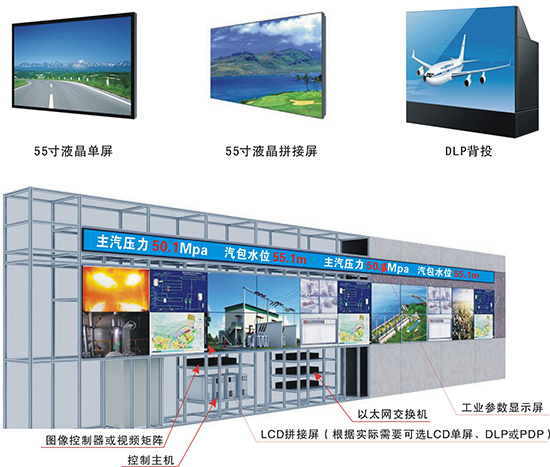 數(shù)字墻中部為大屏幕監(jiān)控系統(tǒng),有LCD液晶單屏或拼接屏、DLP背投拼接屏、LED小間距點(diǎn)陣屏及PDP等離子監(jiān)視器可供選擇。該設(shè)備用于全廠數(shù)據(jù)、視頻、報(bào)警等信息的綜合顯示。