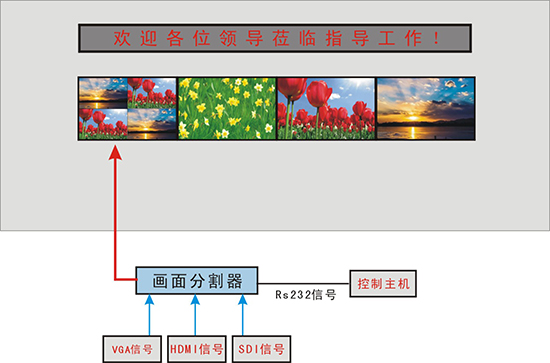 說(shuō)明:上圖中數(shù)字墻上安裝了四臺(tái)75寸液晶,其中一臺(tái)連接了一臺(tái)四畫(huà)面分割器使?一臺(tái)液晶顯示來(lái)自四個(gè)設(shè)備的四個(gè)畫(huà)面,四畫(huà)面分割器由一臺(tái)控制主機(jī)控制。