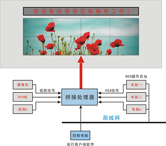 液晶拼接屏典型應(yīng)用拓?fù)浣Y(jié)構(gòu)圖: