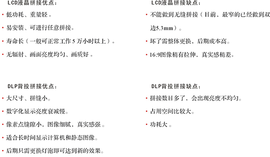 四、LCD液晶拼接與DLP背投拼接的優(yōu)缺點(diǎn)對(duì)比: