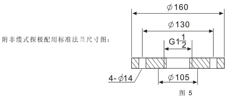 例1、使用要求:介質(zhì)常溫,標(biāo)準(zhǔn)法蘭安裝(尺寸如下圖5);電源AC220V;棒式探極,