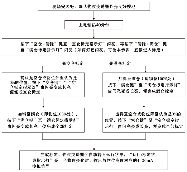 ????本物位變送器必須進(jìn)行空倉(cāng)和滿倉(cāng)兩次標(biāo)定以后才能正常運(yùn)行,可先標(biāo)定空倉(cāng),再標(biāo)